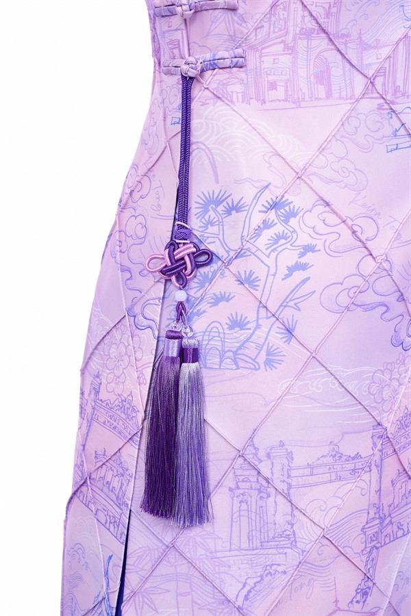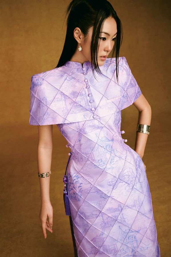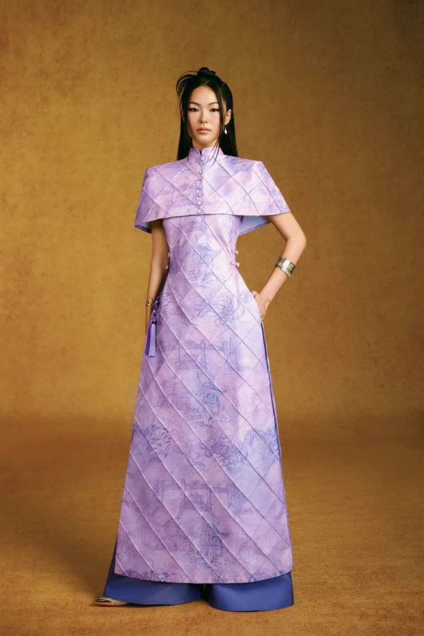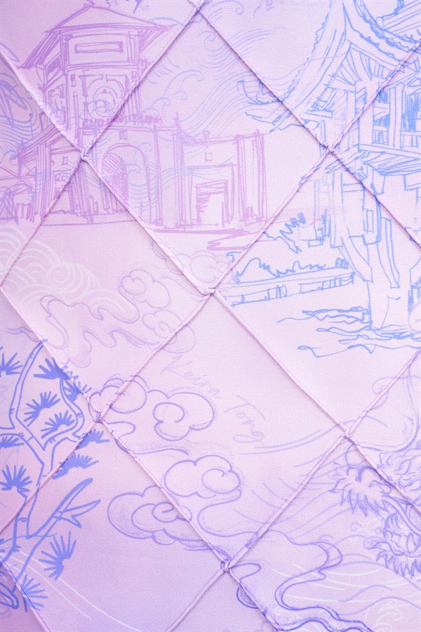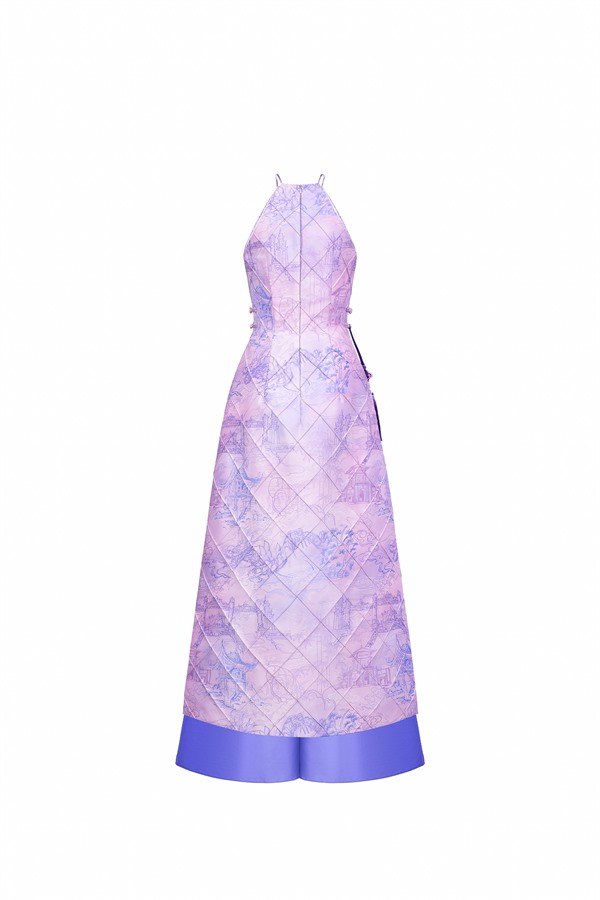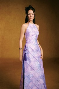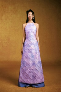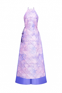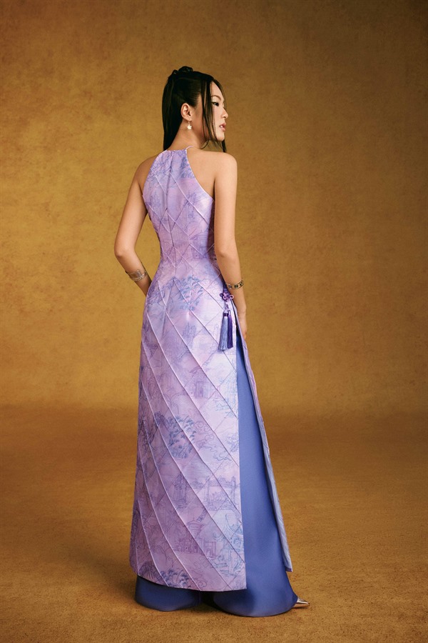 Standing out with the exclusive “Vietnam Scenic Landmarks” pattern designed by Keira Tong, printed on premium Taffeta that offers excellent structure, high-quality finish, and wrinkle resistance. The high halter neckline provides a modest look, preserving traditionality with a handcrafted woven charm at the waist.