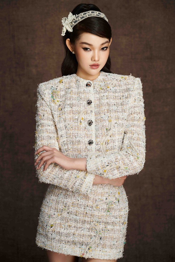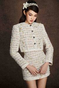 Premium tweed set with springy yarn, structured mesh, and silk lining for a comfortable fit. Delicate beaded florals in harmonious tones complete the look.
