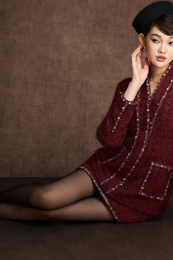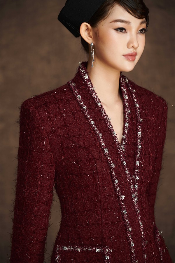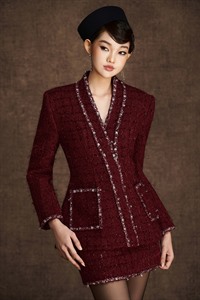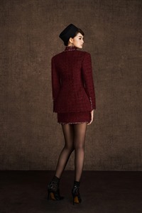 Tweed set woven from a variety of yarns for a luminous effect. Collar, cuffs, pockets, and hem are meticulously layered and embellished, reminiscent of a spring garden. Sold as a set, not separable.