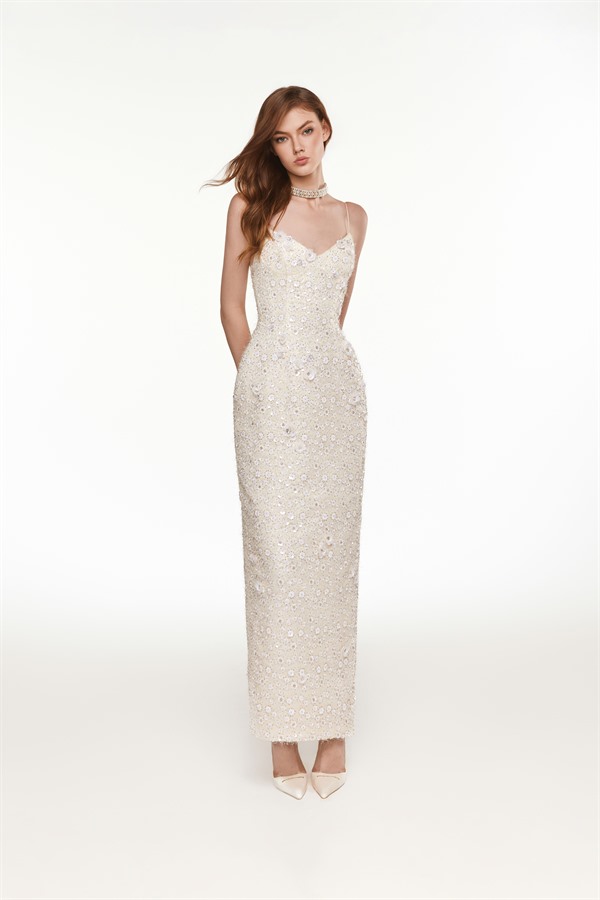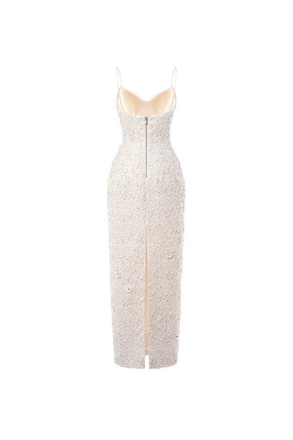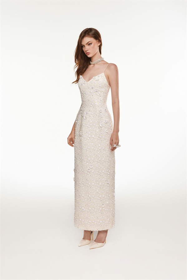The Floral Sequin Dress is crafted from luminous premium silk woven with organic brushed fibers and enhanced with shimmering sequins, presented in an elegant ivory tone.