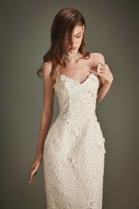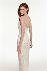 Designed with delicate V-neck straps and a cinched waist that accentuates the hips, the silhouette beautifully sculpts a refined hourglass figure, embodying timeless femininity and understated luxury.